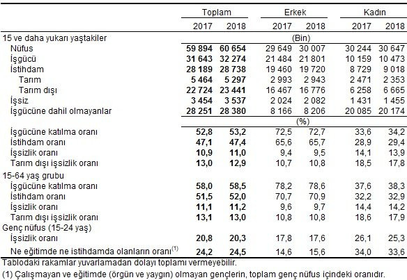 İşgücü 2018 yılında bir önceki yıla göre 631 bin kişi artarak 32 milyon 274 bin kişi, işgücüne katılma oranı ise 0,4 puan artarak %53,2 olarak gerçekleşti. Erkeklerde işgücüne katılma oranı 0,2 puanlık artışla %72,7, kadınlarda ise 0,6 puanlık artışla %34,2 olarak gerçekleşti.