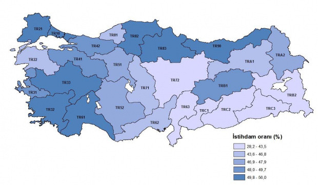 En yüksek istihdam oranı %55,3 ile TR21 (Tekirdağ, Edirne, Kırklareli) Bölgesi'nde gerçekleşti. En düşük istihdam oranı ise %30,5 ile TRC3 (Mardin, Batman, Şırnak, Siirt) Bölgesi'nde oldu.