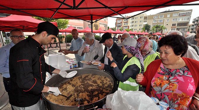 Sağanak yağmura rağmen Cumhuriyet Meydanı’nda uzun pilav kuyrukları oluştu. Belediye Başkanı Ülgür Gökhan da bir tabak pilav alıp yerken, “Helal pilavdır. Helal et, helal bulgur var” dedi.