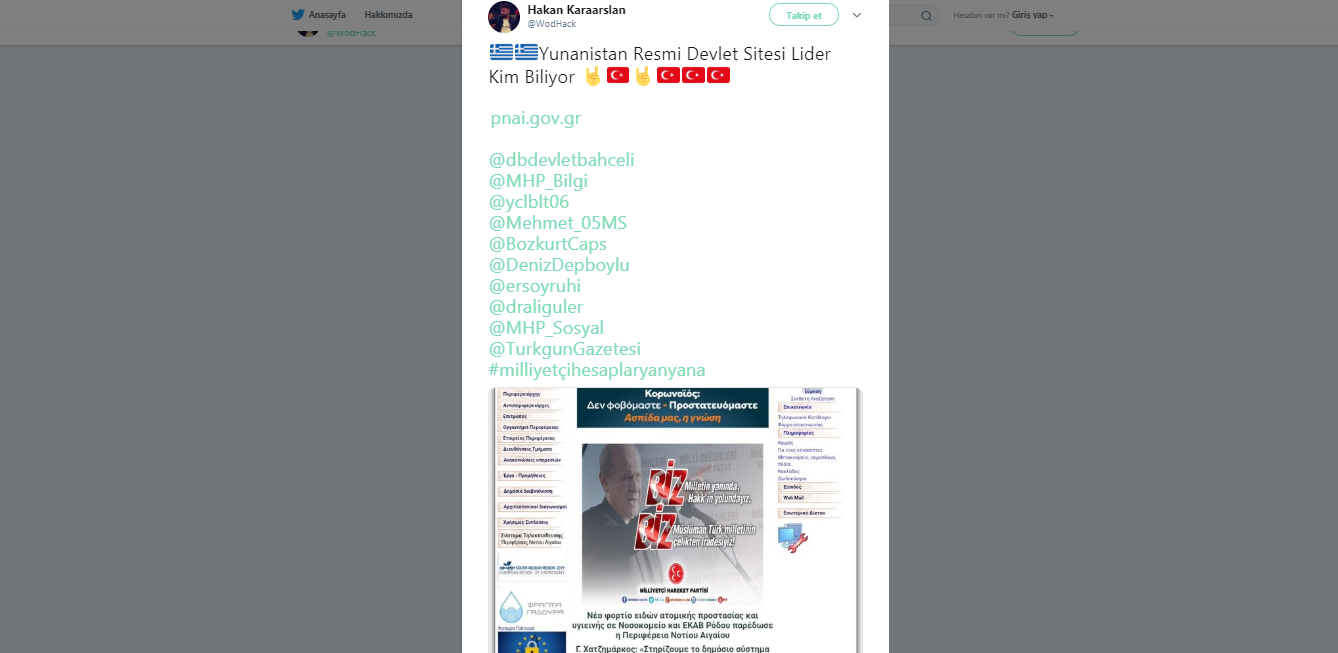 Yunanistan resmi devlet sitesinde bulunan upload açığı sayesinde MHP Lideri Devlet Bahçelinin resmini katan hacker bunu kayıt altına alıp twitter adresinden paylaştı. Attığı Tweet 700'den fazla fav aldı.