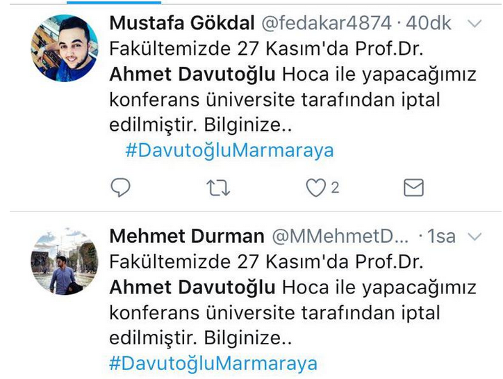 Davutoğlu'na yakın bir kaynak, "Bu iptal üniversite yönetiminin inisiyatifiyle oldu. Hoca daha önce bu üniversitede öğretim üyeliği yapmış biri, şimdi bu üniversitede konuşamıyor" dedi.